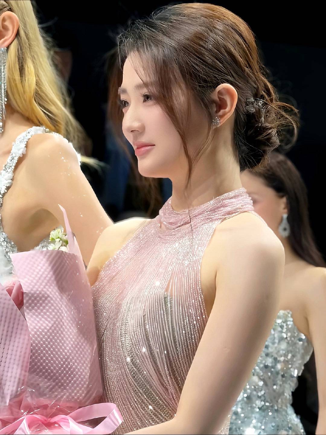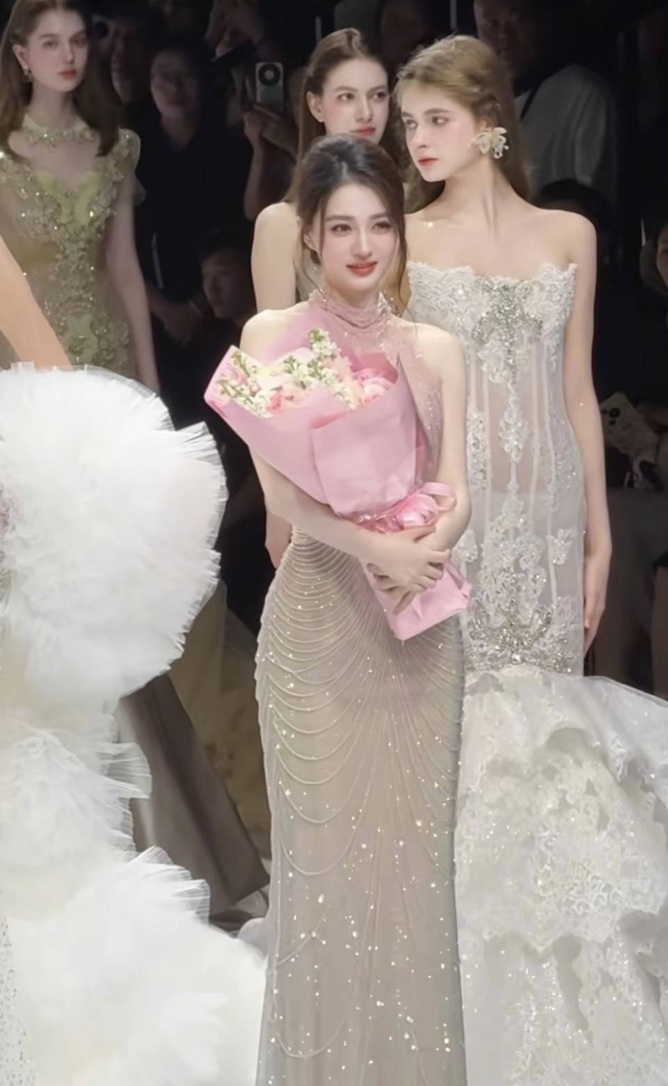 高潮出现在秀场尾声,徐璐被邀请上台接受鲜花。她微微低头,怀抱花束,低盘发造型衬得脖颈修长,气质温婉如古典仕女。社交媒体瞬间沸腾,“徐璐好美啊”“东方美神降临”“玉娆国色”等话题霸榜热搜,单日阅读量破4亿。网友纷纷引用《甄嬛传》台词:“臣妾有一妹妹玉娆,堪称国色”,感慨她从15岁青涩玉娆到30岁明艳女神,骨相优势始终如一,美得愈发有力量。
