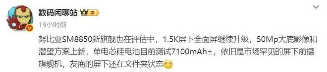 该机的 1.5K 屏下全面屏继续升级,50Mp 大底影像和潜望方案上新,单电芯硅电池目前测试 7100mAh±。